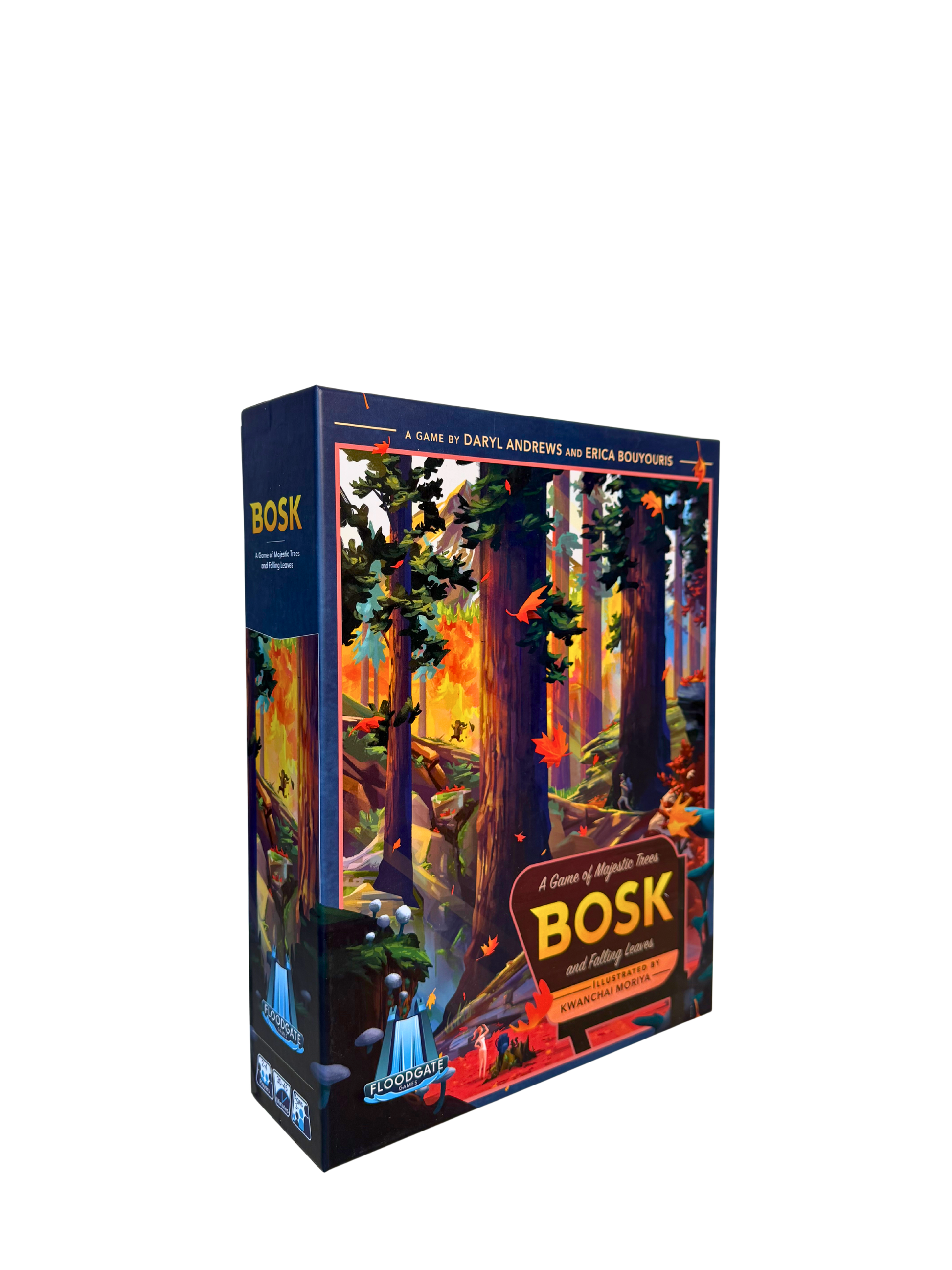 From majestic Maples to ancestral Oaks, players nurture their trees aiming to thrive over the course of a year in a beautiful National Park. In the spring, players carefully grow their trees, scoring as hikers enjoy traveling the trails in summer. When autumn comes, leaves fall in the ever-changing direction of the wind, guided to cover the terrain and other playersÕ leaves. Points are awarded in winter for the most coverage of each region in the park. Gain your ground in the park to be victorious in Bosk!