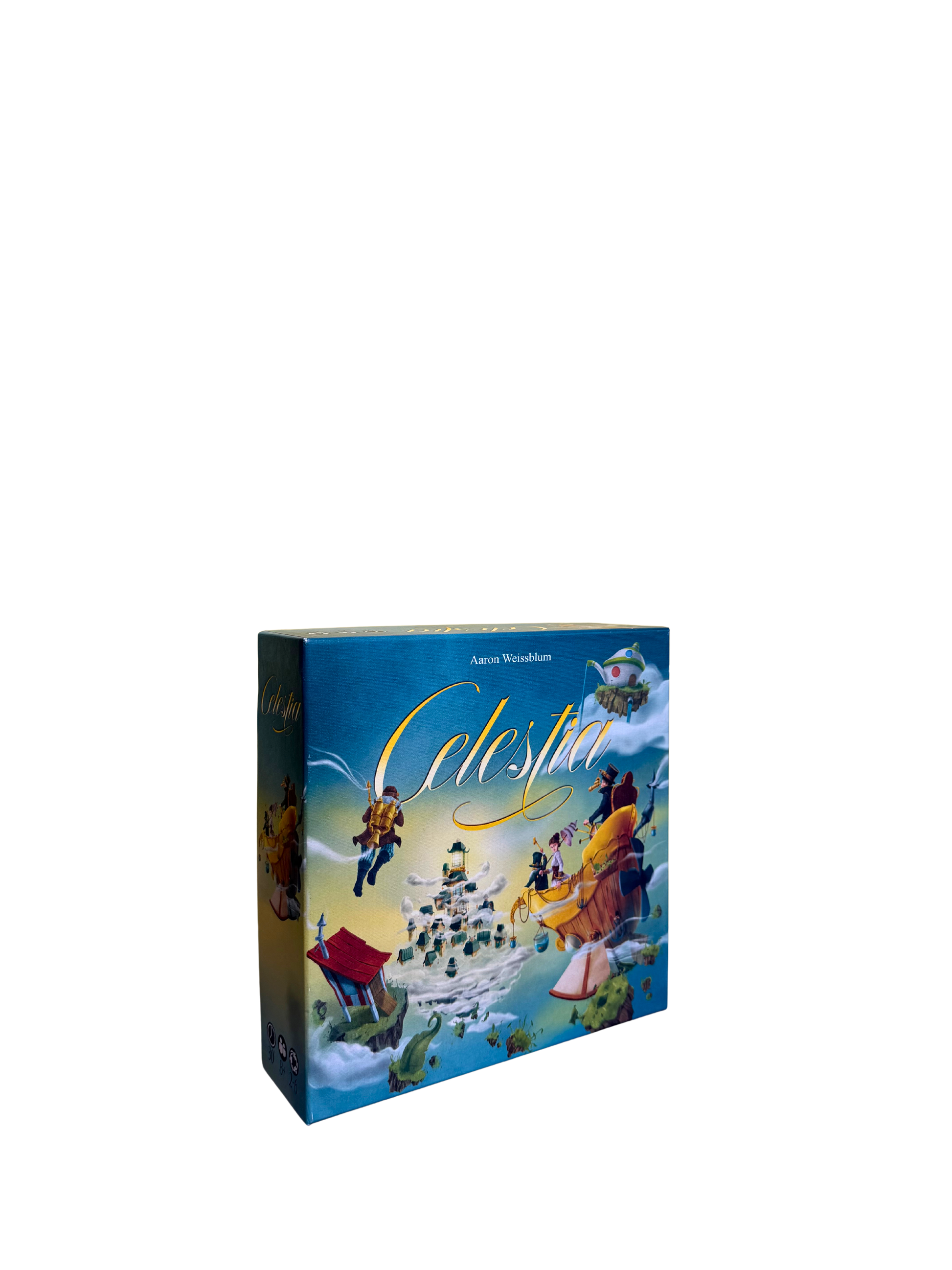 In Celestia, a revamped version of Cloud 9, you board an aircraft with a team of adventurers to perform many trips through the cities of Celestia and recover their wonderful treasures. Your journey will not be safe, but you will attempt to be the richest adventurer by collecting the most precious treasures! At the beginning of a journey, all players place their pawns within the aircraft; the players start the game with six cards in hand (or eight depending on the number of players). At the beginning of each round, one player is chosen to be the captain of the trip and he rolls 2-4 dice to discover the challenges that they will face: fog, lightning bolts, killer birds, or pirates. He must then play the appropriate cards Ñ a compass, a lightning arrester, a foghorn, or even cannons Ñ to continue on the journey and reach the next city. But before the captain plays the appropriate cards, each player must decide whether to stay within the aircraft: If you exit, you're guaranteed the victory points that come from exploring the current city. If you stay on board, you hope to make it to the next city in order to catch more precious treasures. If the captain can't overcome the challenge, though, everyone comes crashing down empty-handed and you'll need to begin a new trip with all passengers on board. During the journey, each adventurer can try to pull out of the game with fabulous objects (a jetpack, astronomy glasses, etc.) or by changing the trip (modifying the travel or abandoning an explorer in the city). As soon as a player earns treasure worth at least fifty points, the game ends and this player wins.