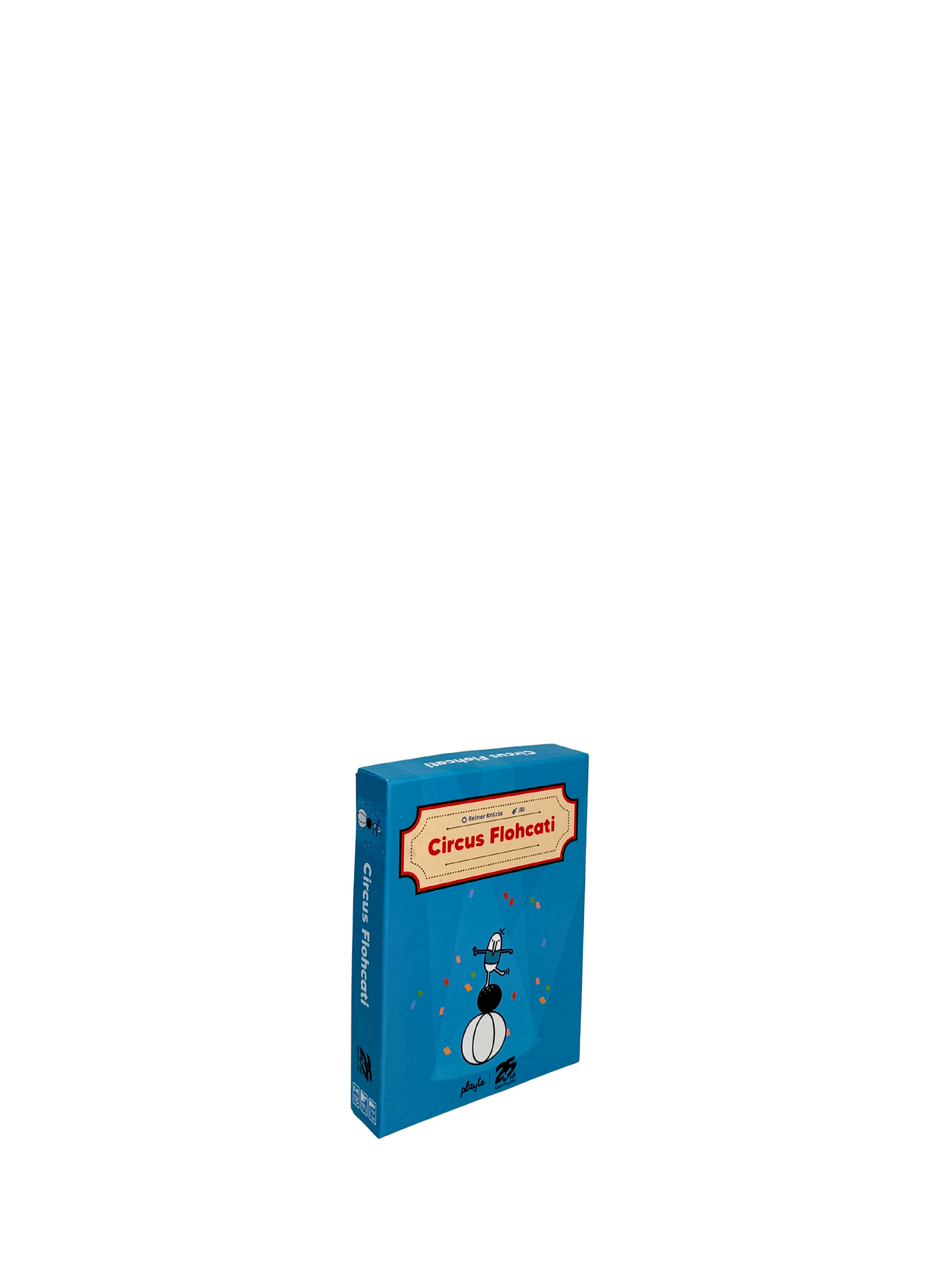 In Circus Flohcati, players collect acts from the flea circus to score points, with the game containing ten types (colors) of acts, with acts being valued from 0-7 points. On a turn, you can choose one of the face-up cards on the table and add that to your hand or flip the top card from the deck and add it to the cards on display. If you flip an action card, you must take that action Ñ often stealing a card from an opponent Ñ then your turn ends. If you flip a card of the same color as any face-up card, then you instead discard the newly revealed card and your turn ends with you getting nothing. Otherwise, you again face the same options: Collect a face-up card or reveal a new card. If on your turn you have three cards of the same value in hand, you can play this trio on the table for a guaranteed 10 points. The game ends either when someone reveals that they have all ten acts in hand or when the deck has been exhausted. You score only for the highest-valued act of each color, so either avoid taking duplicate colors or ditch them in trios. If you have all ten acts in hand, score a 10-point "gala show" bonus. Whoever has the highest score wins.