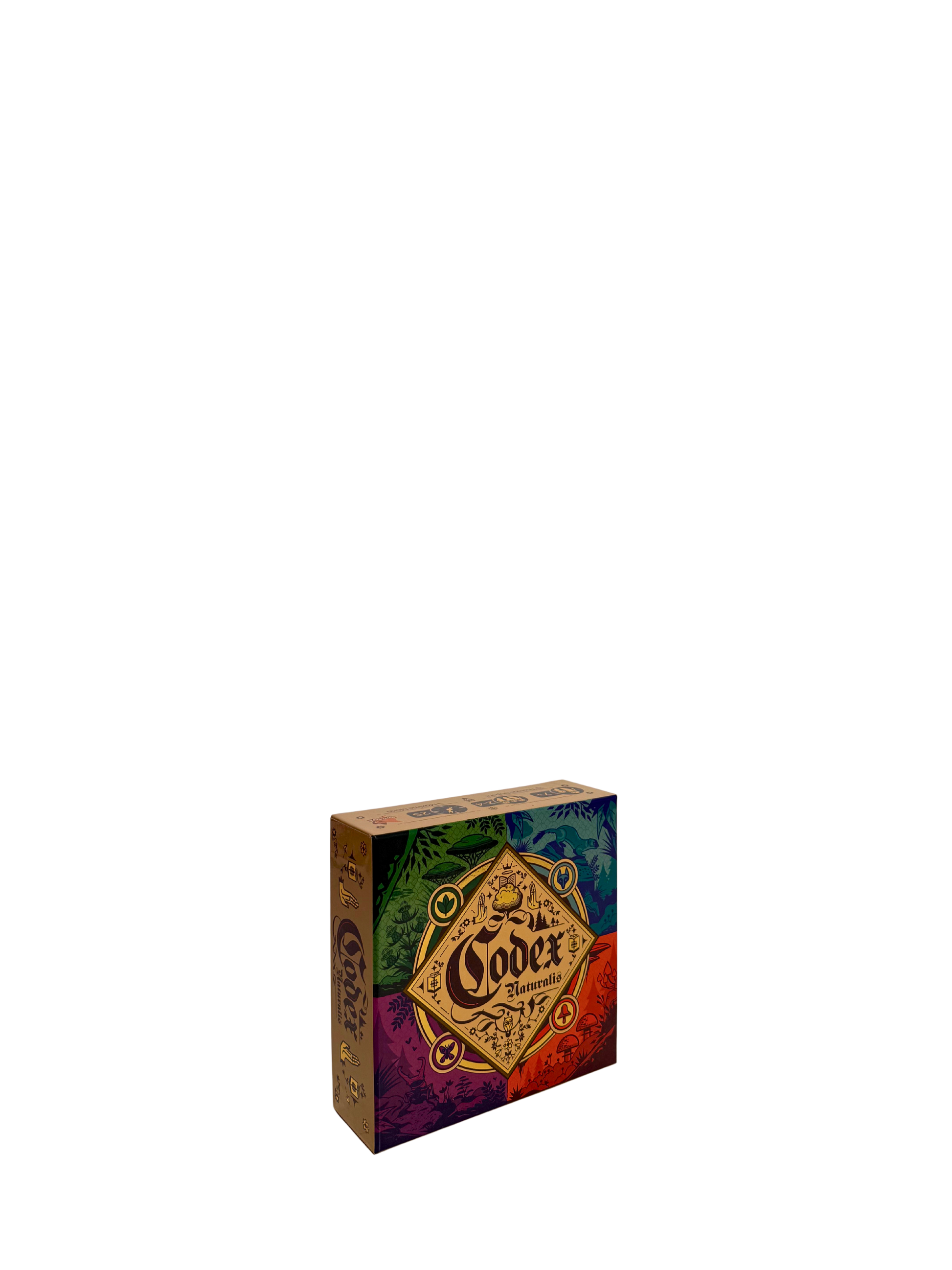 In CODEX Naturalis, you must continue the work of the illuminating monk Tybor Kwelein, assembling the pages of a manuscript that lists the living species in primary forests. Can you put the pages together in the best order possible? And are you prepared to sacrifice a species to develop your manuscript? In the game, each player starts with a single card on the table, a card that shows some combination of the four possible resources in the middle of the card, in the corners of the card, or both. Players also have two resource cards and one gold card in hand, while two of each type of card are visible on the table. On a turn, you place a card from your hand overlapping the corners of one or more cards you already have in play. Your starting card has four overlappable corners, while resource and gold cards have only three. Resource cards have no cost to be played, and they often depict resource symbols in their corners. Gold cards deliver points when played, but they often have a resource requirement, e.g., three fungi or two plant/one animal/one insect, and you must have those resources visible in your manuscript at the time you play the gold card. You score points from this card immediately, with some cards having a fixed value and others a variable one depending on how many of a certain symbol are showing or how many corners you covered this turn. If you wish, you can play a card from your hand face down; such a card has four corners and one resource, but provides no points. After you play, draw a face-up card or the top card of either deck to refill your hand. When a player reaches 20 points, you complete the round, and each player takes one additional turn. Players then score points based on how well they matched two public objective cards and one secret objective card, after which the player with the most points wins.