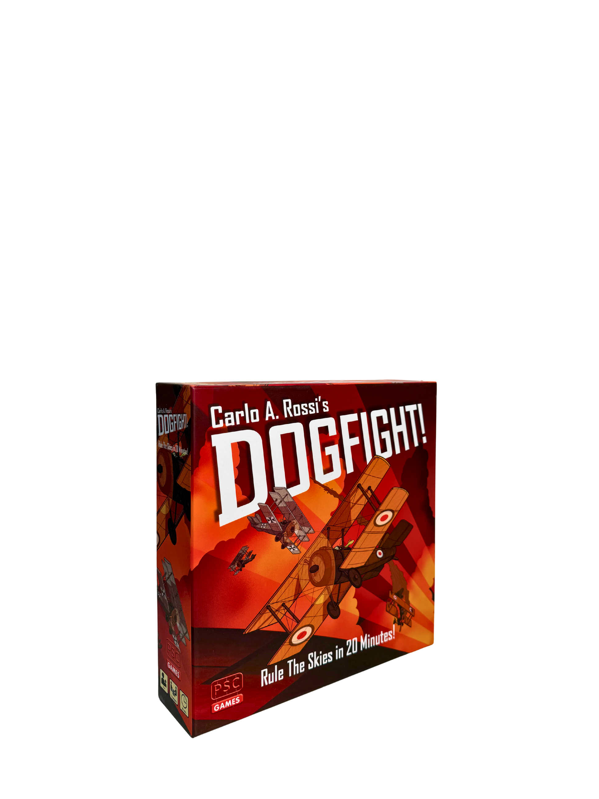 Dogfight! is the latest game to join the acclaimed Blitzkrieg line of 20-minute games. In Dogfight! two rival aviators of the First World War duel each other with Biplanes across the sky. To defeat your enemy, you must maneuver yourself to get behind them and shoot at exactly the right moment! Dogfight! is played over a maximum of three rounds or until one of the Biplanes has been shot down. If a Biplane is shot down, the game ends immediately and the surviving player is declared the winner! If the third round ends and neither Biplane has been shot down, the player who has taken fewer hits is the winner. Both players choose a tile to play from behind their player screens and simultaneously reveal them. Each player then moves their Biplane the number of spaces equal to the value of the tile played, which may also have "hit" icons. The game features nine Biplanes, and they have different tile distributions. Several scenarios are also included. The Biplanes must follow the direction of the arrows around the white path (except when Looping the Loop). Each circle counts as one space and the colors on some spaces affect shooting. Biplanes may move past one another and even finish in the same space, but be careful -- one wrong move and your enemy will loop behind you and blast away!