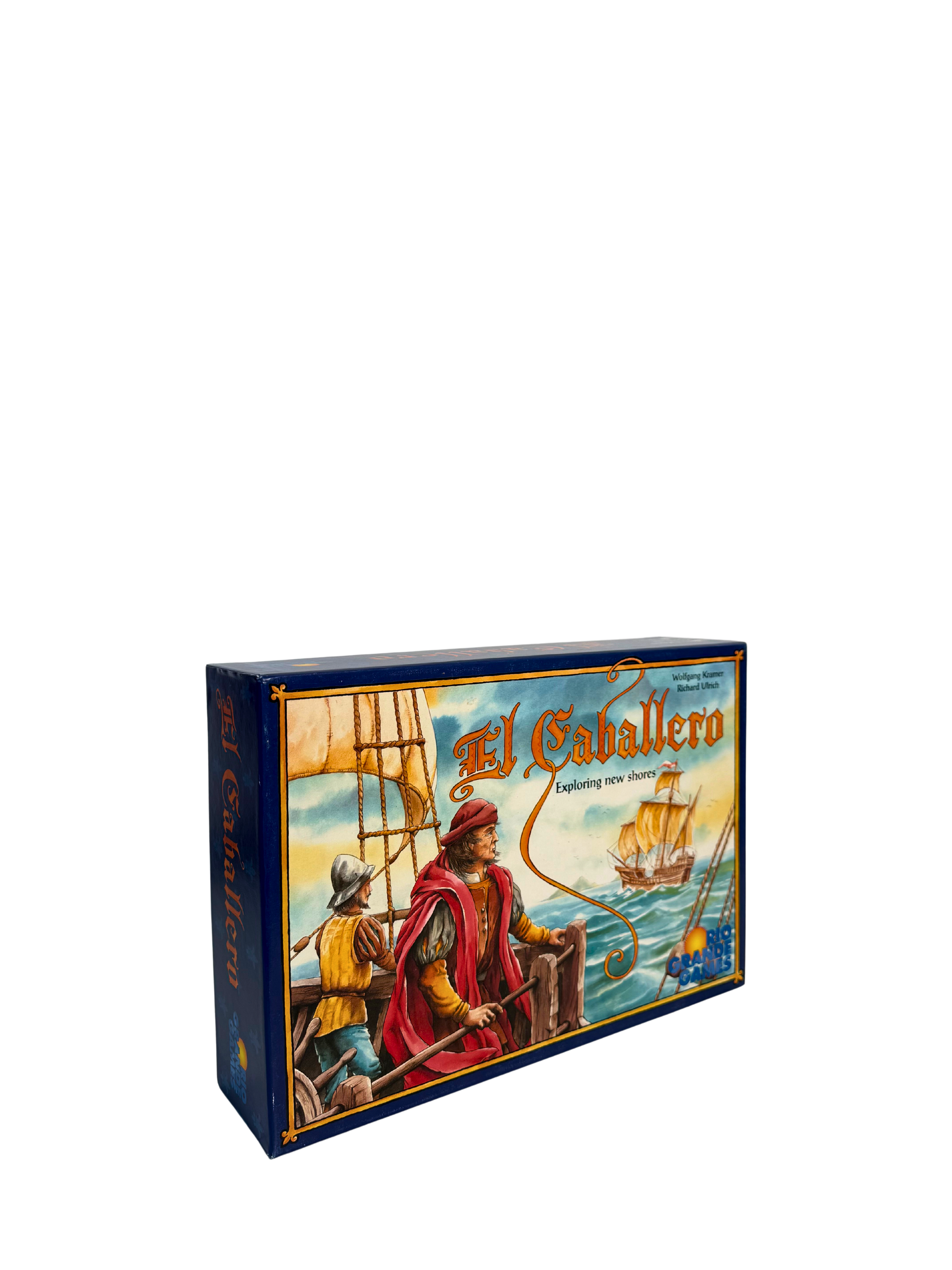 Although referred to as a sequel to El Grande, El Caballero shares few aspects with its namesake, being a fun but intense brain-burner in which players explore and attempt to control the lands and waterways of the New World. The players are following Columbus by exploring the islands he discovered. Players slowly explore the islands Ð by picking and placing land tiles that are most favorable to them Ð and discover wealth in the form of gold and fish. As they learn about the land and sea areas of this new land, they position their caballeros to try to maintain control of the important regions. Castillos give them a measure of protection from others, and ships allow them to establish trade and to fish for food. Success is measured in the size of land and sea areas they control. Their success is measured twice, and in the end these scores are summed and the winner declared.