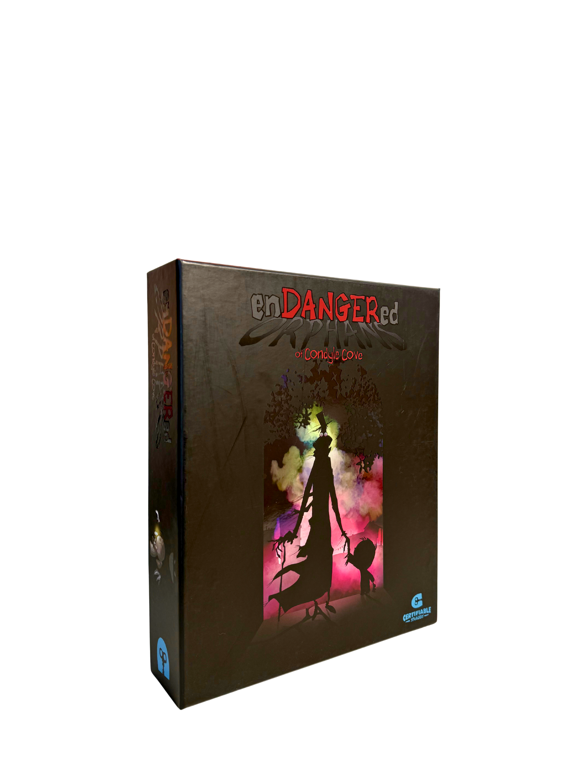 A deplorable tabletop game devoid of joy, hope, or humor; which, regrettably, is also far more awesome than it has any right to be. In Endangered Orphans of Condyle Cove, players take turns choosing to move around the board, playing options to either help their orphan survive, or make their opponent's orphan suffer. When an orphan either runs out of options, or in an act of desperation, reveals the boogeyman, the boogeyman takes the orphan. When all but one orphan are taken by the boogeyman, the game ends, and the last orphan to survive is the winner.