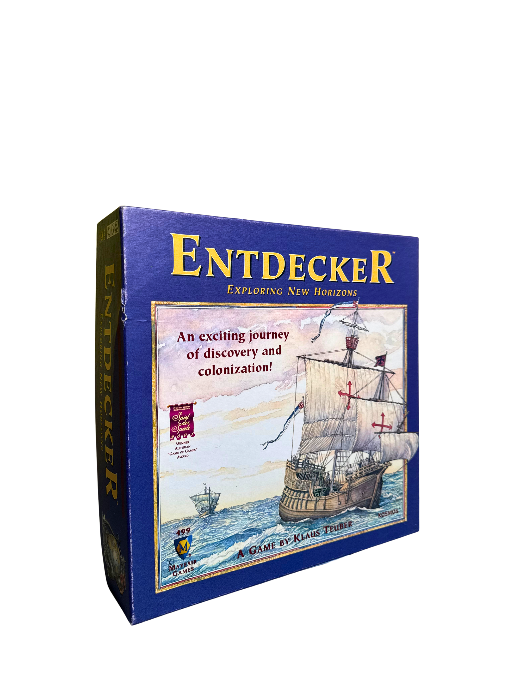 A reworking of the game Entdecker, this game still starts with a blank game board that represents an unexplored sea. Tiles are drawn and placed on squares on the board. As the tiles are placed, islands develop on the board and players pay to place settlements, forts, or scouts on these islands in an effort to become the most powerful explorer. Completed islands yield victory points to all who have invested in exploration on an island, but of course the most points go to the player who has established the strongest presence. This updated version adds a larger board, fees to enter from all but one edge of the board, a different income system, new bonus waterfall tiles, the ability to draw (for a price) from open stacks of tiles, and most of all an entirely new area of the board that represents scouts exploring jungles on the islands in search of exotic plants (this is the bonus discovery chip system revamped), and other changes.