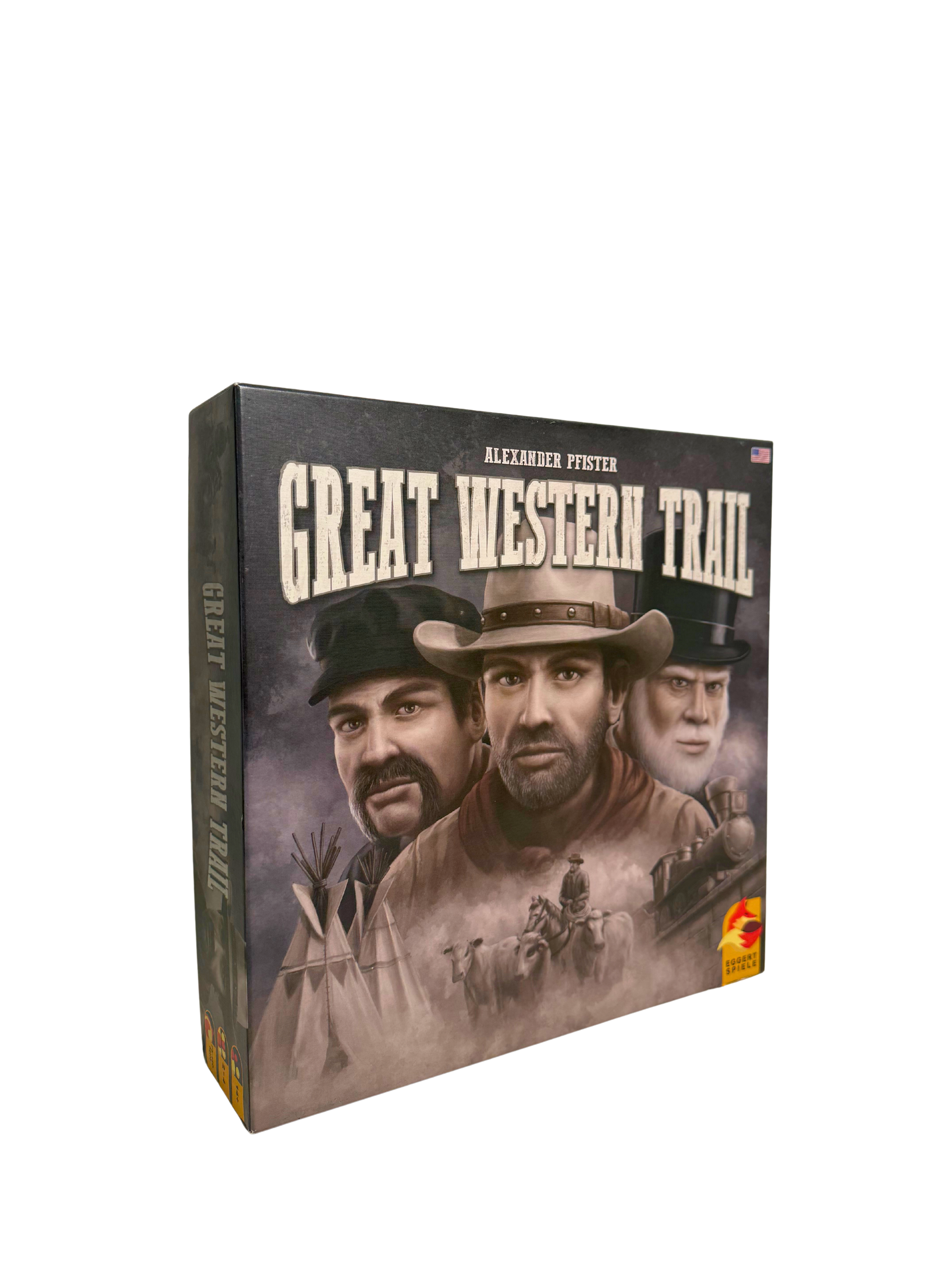 America in the 19th century: You are a rancher and repeatedly herd your cattle from Texas to Kansas City, where you send them off by train. This earns you money and victory points. Needless to say, each time you arrive in Kansas City, you want to have your most valuable cattle in tow. However, the "Great Western Trail" not only requires that you keep your herd in good shape, but also that you wisely use the various buildings along the trail. Also, it might be a good idea to hire capable staff: cowboys to improve your herd, craftsmen to build your very own buildings, or engineers for the important railroad line. If you cleverly manage your herd and navigate the opportunities and pitfalls of Great Western Trail, you surely will gain the most victory points and win the game.