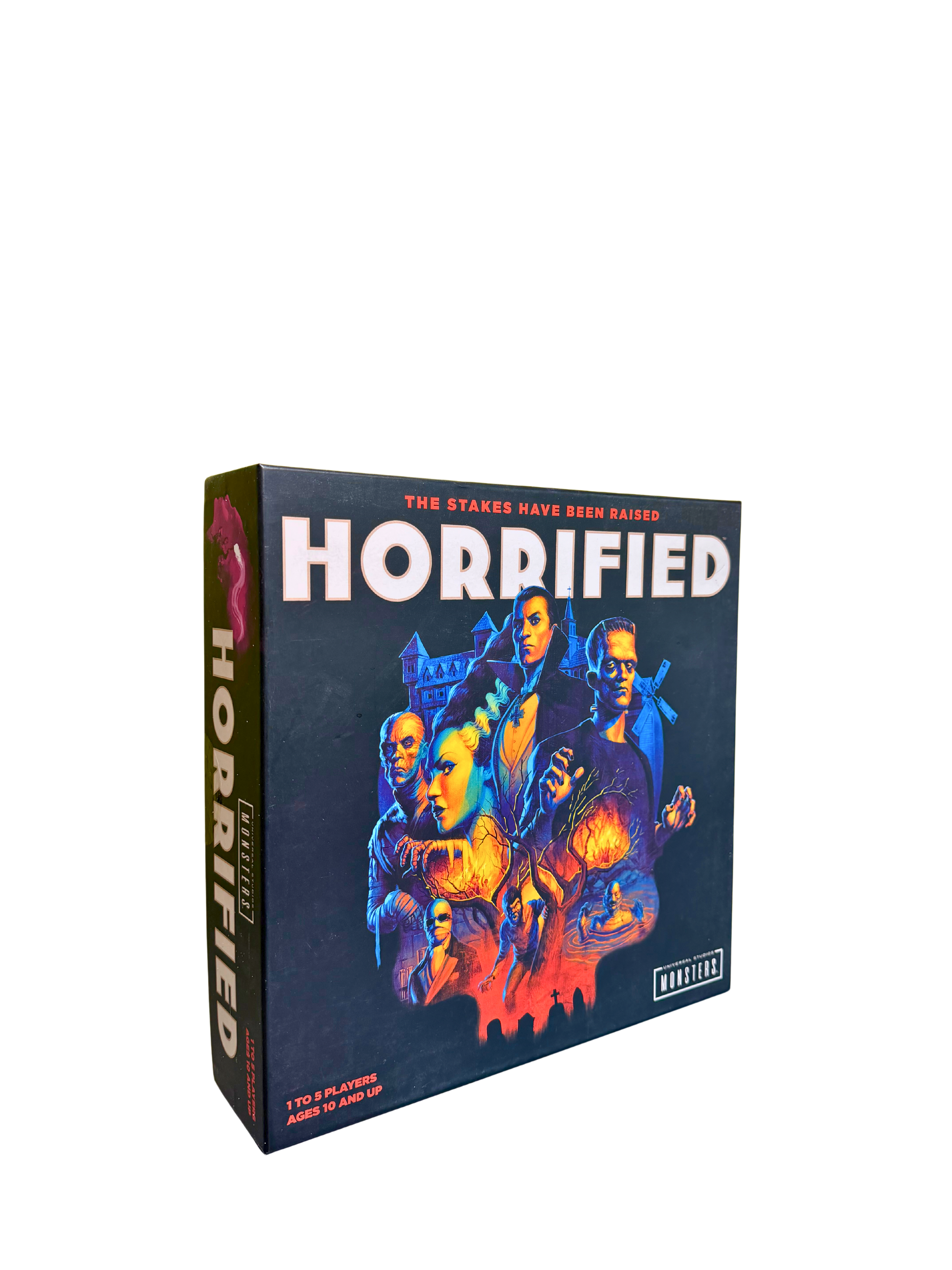 The stakes have been raised. Imagine living in a place so wretched that it's not plagued by one, two, or even three monsters Ñ but seven of the most horrifying fiends! In this game, you'll come face to face with them all as you work together to rid the town of the maniacal or misunderstood creaturesÉbefore it's too late. Horrified includes high-quality sculpted miniatures (Frankenstein, The Bride of Frankenstein, The Wolf Man, Dracula, The Mummy, The Invisible Man, Creature from the Black Lagoon). Its innovative, easy-to-learn, cooperative gameplay has players working together against the monsters with varying levels of difficulty. Just as each monster is unique, they require different strategies and tactics to be defeated.