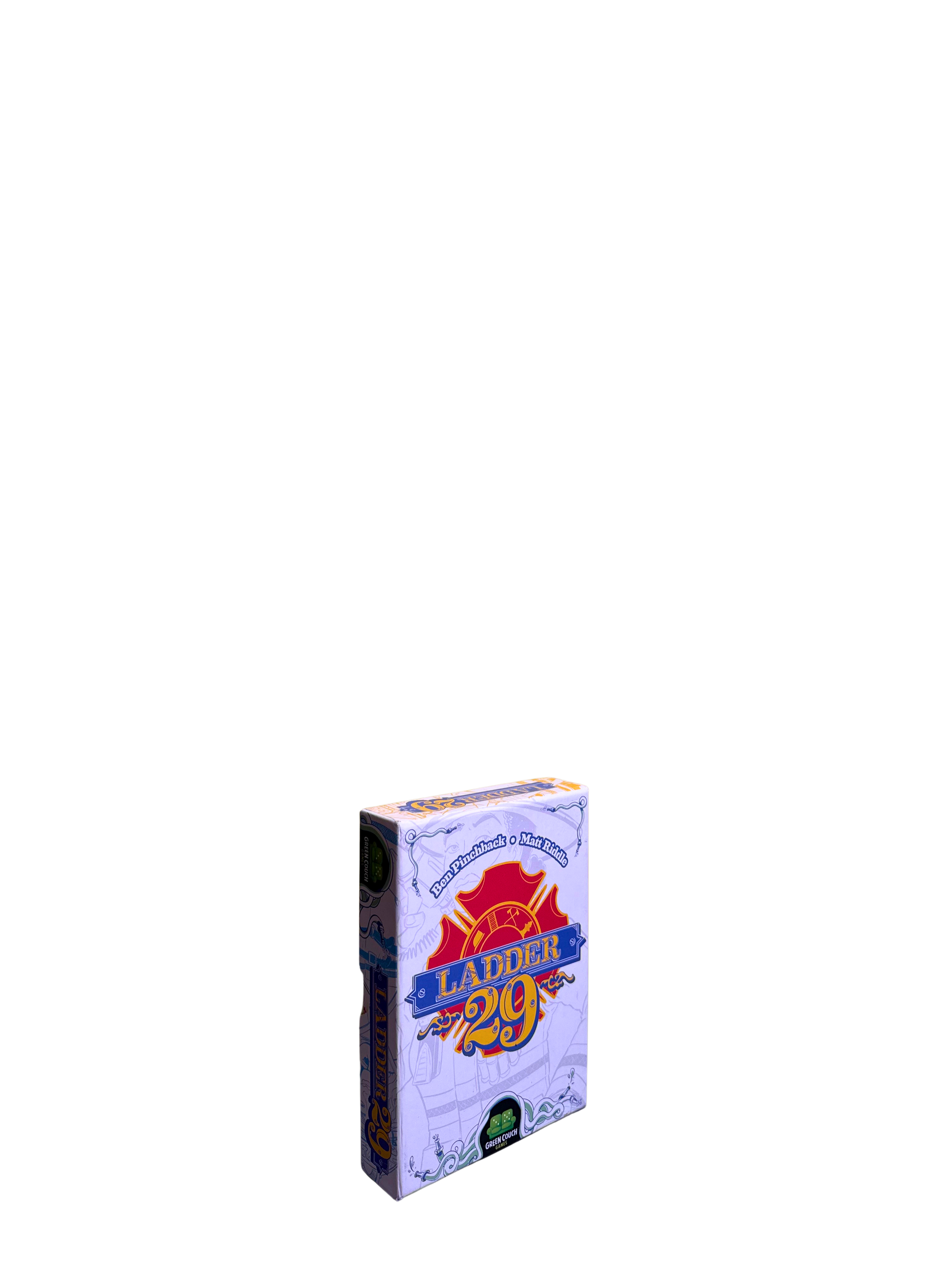 Ladder 29 is a hot game of ladder-climbing firefighters. As experts in the time-honored business of firefighting, players attempt to extinguish their hand of cards while facing difficult challenges that hinder their abilities and choices. Players must decide when to play it safe and when to put it all on the line in this easy-to-learn game that is sure to turn up the heat around the gaming table! Ladder 29 is played over several rounds in which players are dealt 13 cards each, pass three cards to the player on the left, then in reverse scoring order select a hotspot card; this card details the number of points awarded depending on the position the player goes out and a challenge that applies only to that player for the round: a player may only be able to lead singles, end runs in even numbers, or have limitations on what suits can be played in sets. The bigger the risk taken, the bigger the potential reward. The first player to "extinguish" their hand by playing all 13 cards wins the round and earns the most points possible on their hotspot card. Play continues until additional players go out, with all except the one who goes out last earning points for their finishing position.