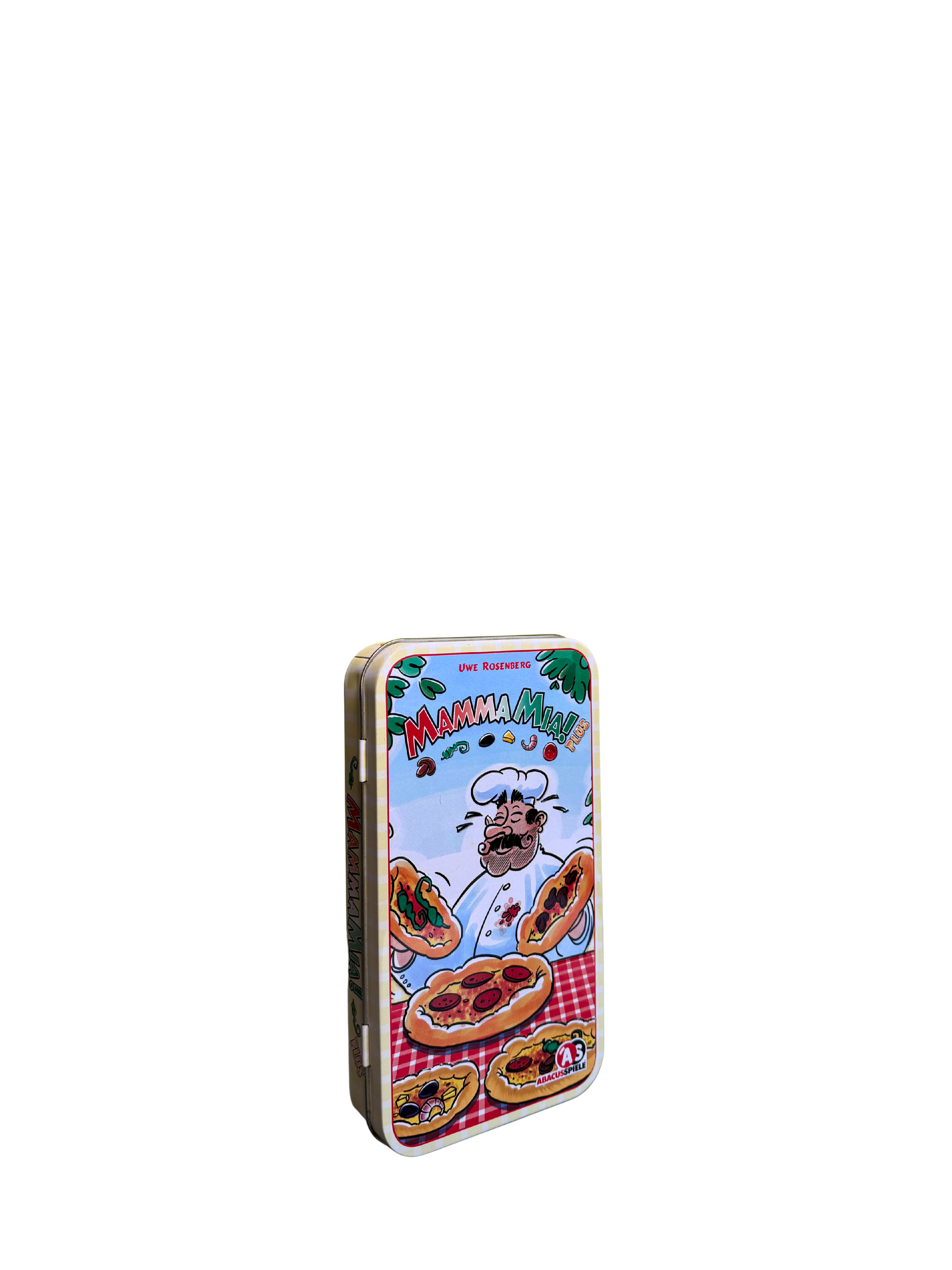 This is a re-make of Mamma Mia! that incorporates cards from Sole Mio!, includes enough cards for a sixth player, and adds a new ingredient (shrimp). Each player is given fifteen different pizza orders to fill, and on his turn adds ingredient cards and then an optional pizza order to a common pile. After the draw pile is exhausted, the common pile is flipped over and the cards in it are sorted by ingredient until an order comes up. If there are enough ingredient cards to fill the order, the player scores it. If there aren't enough, the player can either make up the difference with cards from his hand or put the order back into his 'to be filled' pile. After three to four rounds, the player with the most filled orders wins. Contents: 90 Ingredient cards (15 each of Pineapple, Olive, Green Pepper, Mushroom, Salami, Shrimp) 90 Order cards (15 orders in each of 6 player colors) Rules in German, English, French, and Italian