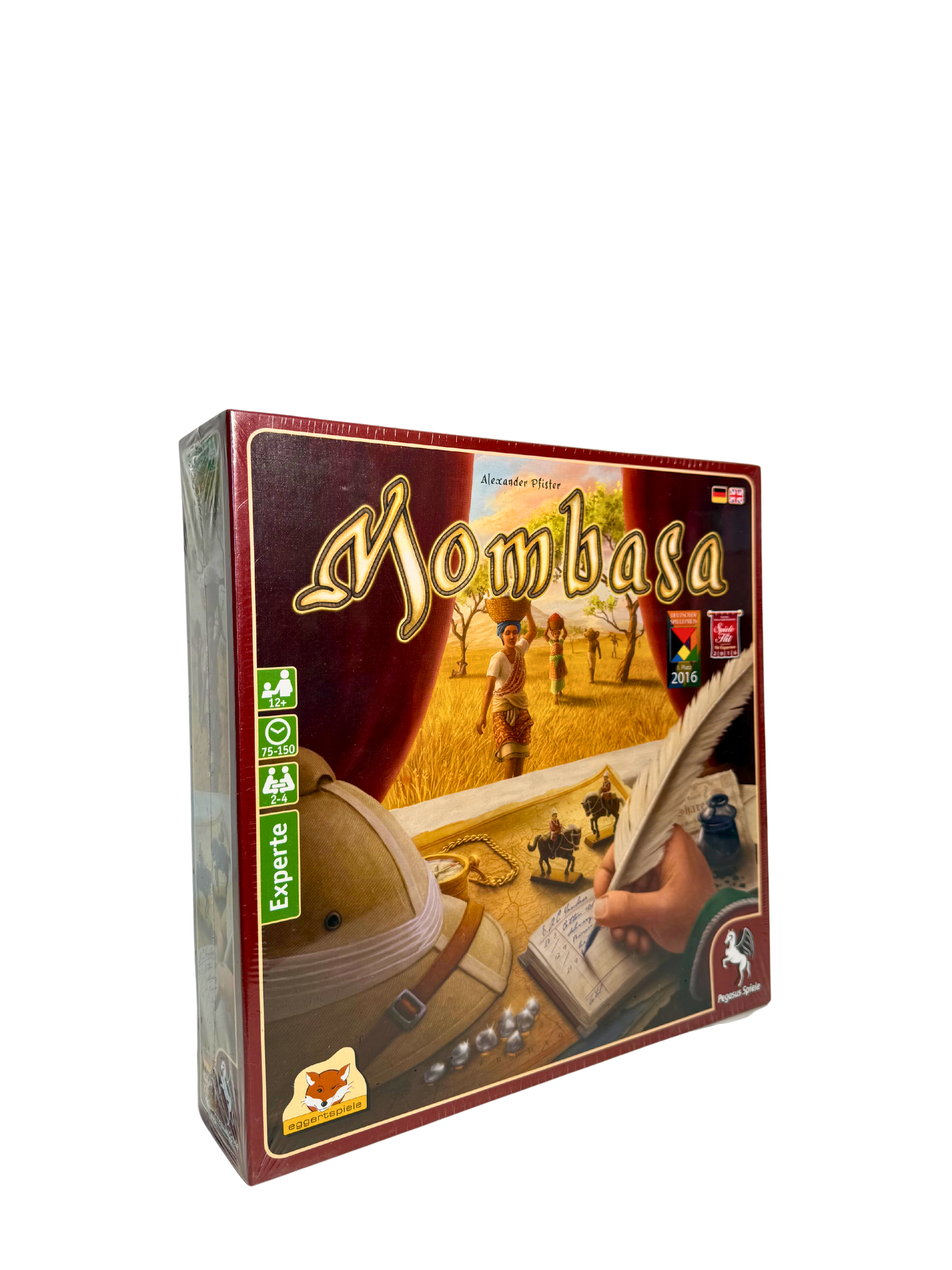 In Mombasa, players acquire shares of chartered companies based in Mombasa, Cape Town, Saint-Louis, and Cairo and spread their trading posts throughout the African continent in order to earn the most money. "As I expected, the East African Company's network of trading posts has spread far into the West. They were even able to expand into a couple of diamond mines. It seems reasonable to invest our recent yield here in Mombasa, rather than to continue our unrivalled commitment in Cape Town. After all, it can only be to our advantage to have other irons in the fire. And when the day of reckoning comes, it will show whether our hoarding of holdings and our intransigent eagerness are worth it..." Mombasa is a tense Euro-style strategy game set in 19th century Africa in which players invest in four chartered companies. Using influence to help them expand across the continent improves the value of the players' shares in these companies. Players will also trade in bananas, coffee or cotton, work together with diamond merchants and ensure that the accounts are kept up to date. To make the most of this one will need to have the correct action cards (back) in hand at the same time, which needs excellent forward planning. Mombasa features a unique, rotating-display hand-mechanism that drives game play: Players start with an identical hand, but acquire new and more powerful cards from the rotating display throughout the game. Each round players choose action cards from their hand, place them face down in the so-called action slot (beneath the player board), and then reveal them simultaneously to carry out the actions. At the end of the action phase, each card is moved to the so-called resting slot (above the player board). Cards in the resting slots are inactive and cannot be used until they are recovered - each round one can only return cards of one resting slot which is why it can make quite a difference in which action slots certain cards are placed. The game ends after seven rounds, players add up their scores in different categories, and the player with the highest score (who has earned the most money) wins the game. With a variety of paths to victory and double-sided company boards, each game will be a new and different challenge.