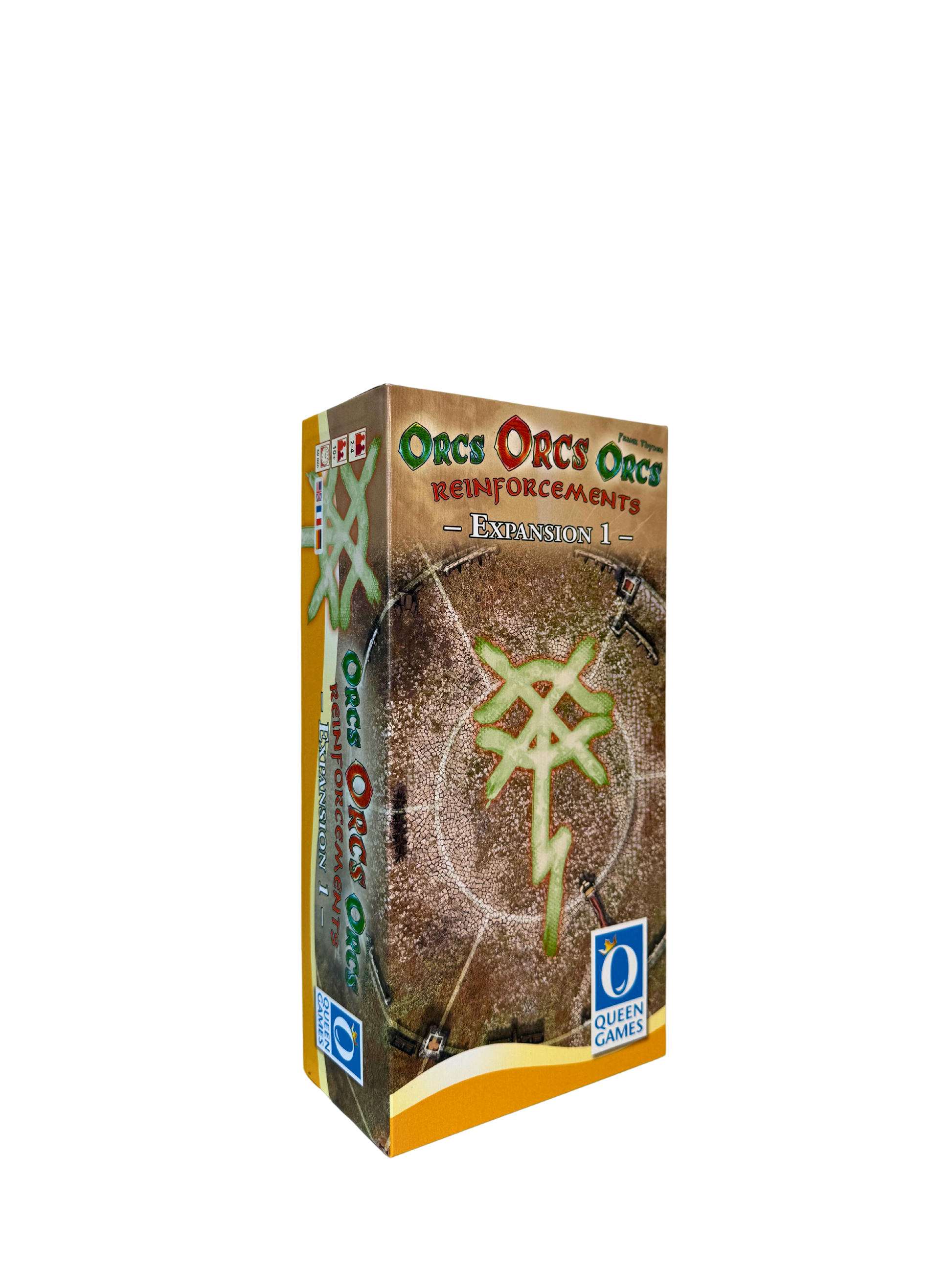 Orcs Orcs Orcs is a game for two to four players that combines two excellent game mechanics that have not been paired before (deck building and tower defense) and has players casting spells, squashing orcs and rolling up the score in the Orc Squash Tournament. The mages start the game on top of the tower in the middle of the battlefield. The battlefield consists of six lanes, each with three sectors, radiating out from the tower. On these lanes, the orcish hordes will try to charge all the way towards the tower. Your job is to defeat them before they can reach you. At the beginning of each game round players draw a fate card, which will determine which category of creatures will advance one sector towards the tower and sometimes implement a nasty rule change for that particular game round. There are three categories of orcs which differ in strength and special abilities that are conveyed to a player once an orc is defeated. The game ends when you run out of orcs on one of the four lanes. During the final scoring, players count up their defeated orcs and multiply them by the number on the creature counter, get points for each support spell learned and subtract points for each poison card in their deck. Whoever has the most points will be declared "Master Mage"!