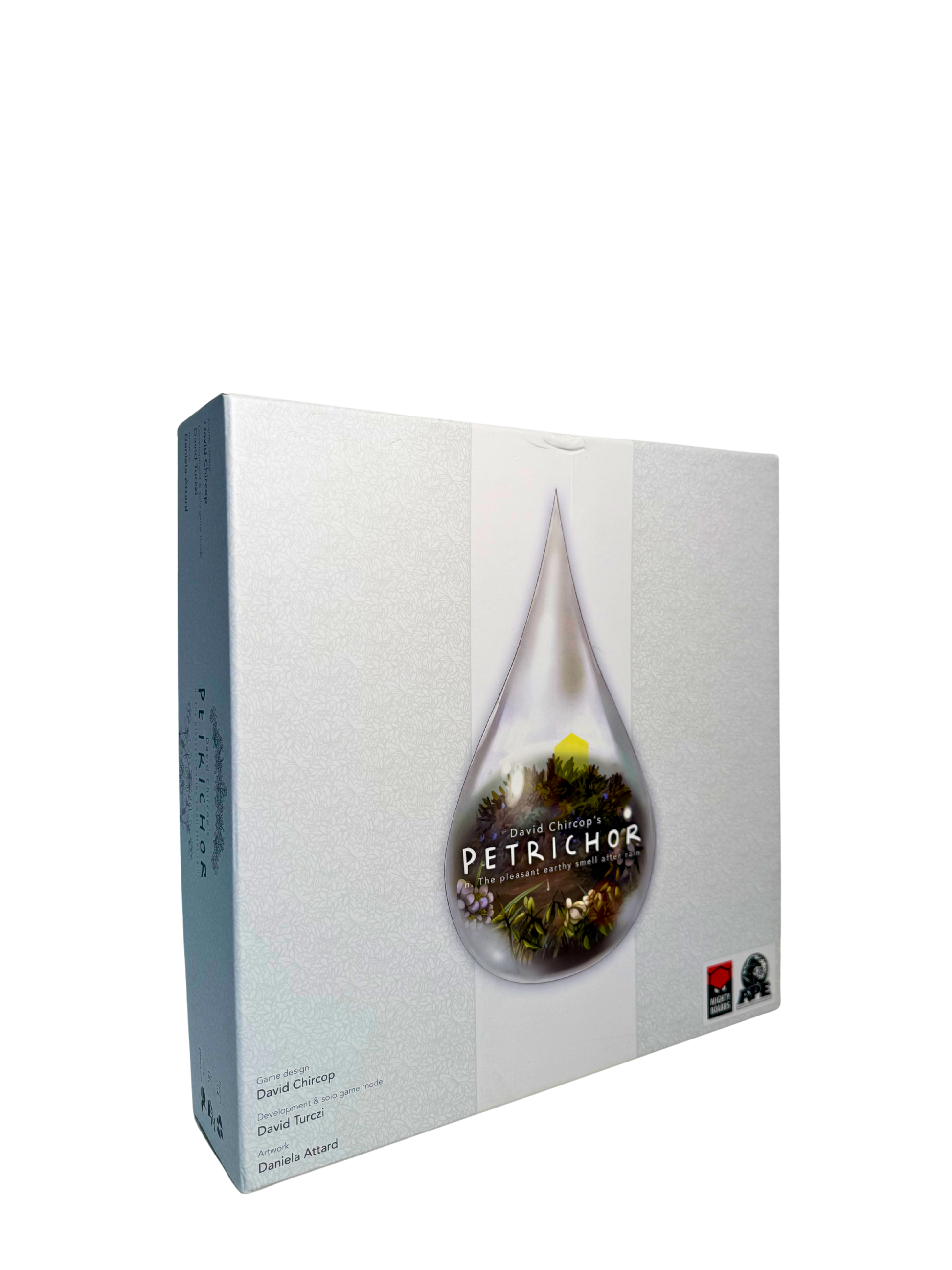 Petrichor is the earthy scent produced when rain falls on dry soil. The word is constructed from Greek (¹____) petra, meaning "stone", and (____) _ch_r, the fluid that flows in the veins of the gods in Greek mythology. Welcome to the lush world of Petrichor; you are a cloud. Your entire purpose in life is to expand, sire other clouds and water crops. Unfortunately, your mates (who are also clouds) have a similar plan. ItÕs up to you to manipulate the weather and assimilate these rogue clouds to contribute to the growth of as many crops as possible - all in order to claim the title of Most Valuable Cloud. Petrichor is an interactive, action selection/area influence game, with 4 simple actions which interact with the various fields in ever surprising ways. The players move clouds with water droplets, and then rain those droplets onto specific fields, to make sure they have the right amount of water for the Harvest. During a Harvest, crops that have been watered enough are scored! Players are able to influence when, and how often the harvest happens. Players need to strike a fine balance between maintaining control of the different fields as well as influencing Harvest, to make sure the two come together at the optimal time. This Collector's Edition comes with a new Artwork and includes the Flowers, Honeybee, and Greener Pasture expansions.