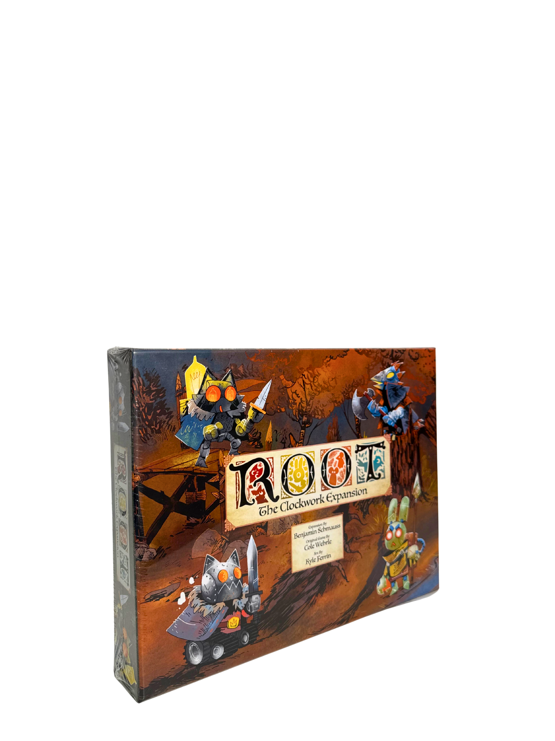 Root: The Clockwork Expansion allows players to square off against four fiendishly automated factions. Insert a faction to round out a low-player count game or team up for co-operative play! Compete against the: Mechanical Marquise 2.0 - Dodge her marauding patrols as you try to stop her from completing her building tracks. Electric Eyrie: Shore up the Woodland's defenses against this fearsome invader. If they go unchallenged, the Woodland will soon be flooded with their forces. Automated Alliance - Police these radicals and raze their bases before a little uprising turns into a massive rebellion. Vagabot - Hunt the dastardly Vagabot across the many clearings of the game or attempt to court him with items.