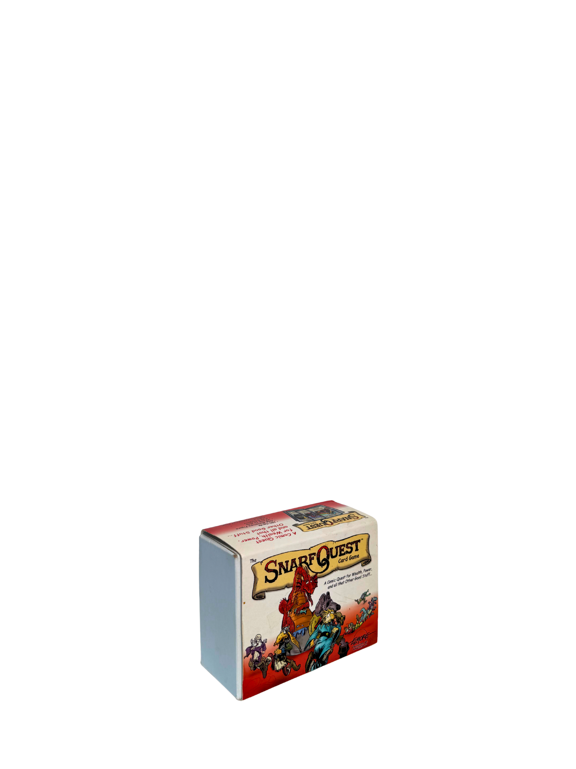 The King is dead! Who will lead the Zeethvahs? According to Zeethvah tradition, every warrior is eligible to rule. The rules of succession are simple.... one year from this date, the warrior that has aquired the most riches or has performed the most heroic deeds will become OUR NEW LEADER! The goal of the Snarf Quest Card Game is to take our hero Snarf through a grand adventure and acquire as much treasure as possible. Each player is making his own adventure for Snarf. At the end of the game, the player with the most treasure is declared to have the best Snarf adventure and becomes king of the Zeethvah village and WINS! There are two basic departures from most card games. One, everyone draws from the same deck (known as the storydeck). Two, nobody ever holds cards in his hand. All cards are displayed where everyone can see them. During each players turn, he controls Snarf (represented by the supplied miniature) and his actions. You must spend Action Points to move Snarf up and down the storyline (ten cards placed side by side next to the storydeck). As these storylines are activated, they are removed, the story line moves together and a replacement card is placed in the storyline next the the storydeck (the draw pile). Activated cards can help you or hurt your opponents, depending on what happens in the storyline. At the end of the game, the player with the most Treasure Points, Wins. The basic game comes with 50 cards, a snarf miniature and is made for 2 to 3 players. However, with each additional 20 cards you add to your deck, one more player can be added. 5 is the recommended maximum. 20 card expansion sets can be purchased that also include a new miniature. Each of these expansions is based around a different character from the Snarf Quest comic strip. This is not a collectable card game, all starter and expansion decks are identical.