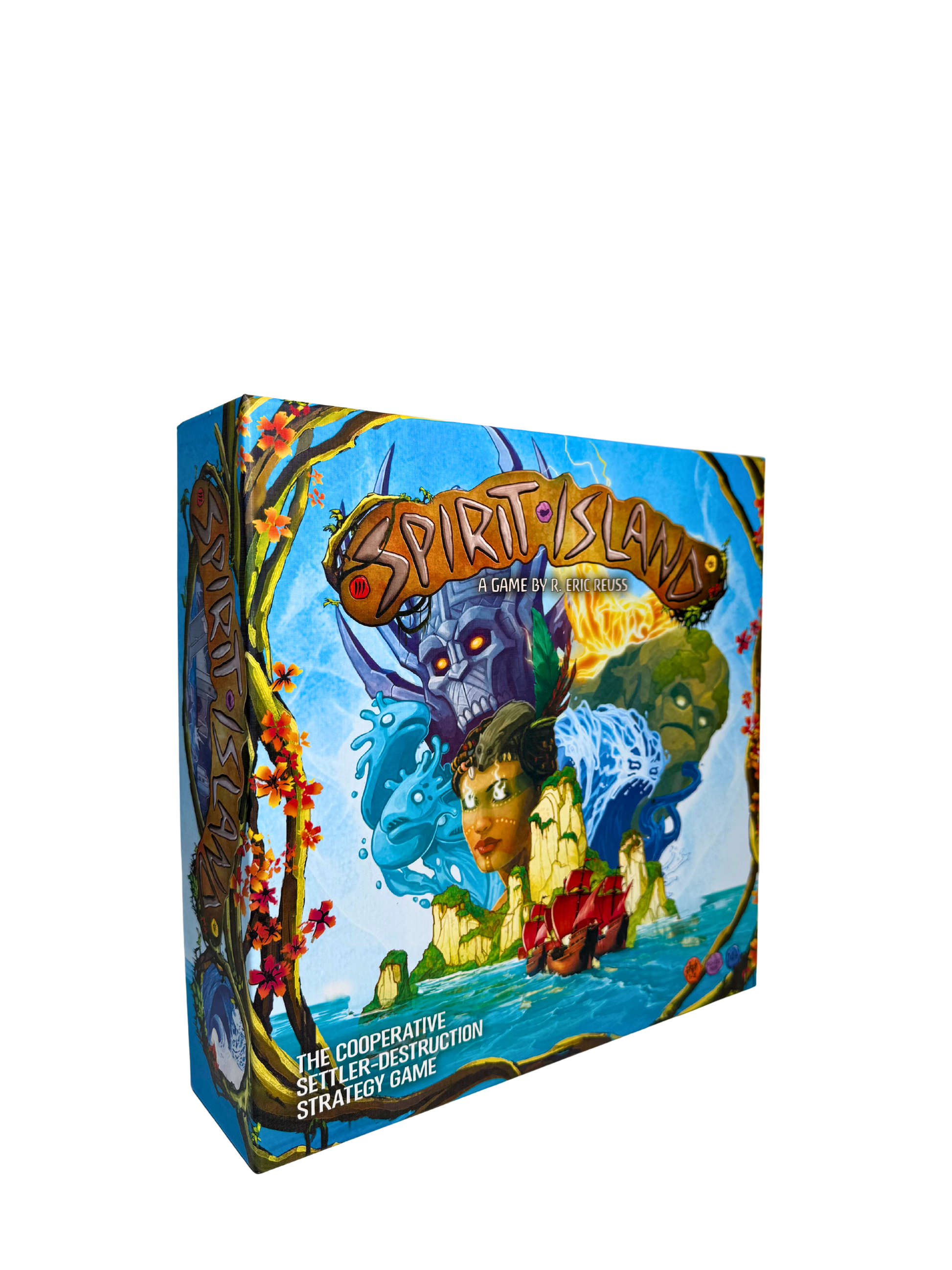 In the most distant reaches of the world, magic still exists, embodied by spirits of the land, of the sky, and of every natural thing. As the great powers of Europe stretch their colonial empires further and further, they will inevitably lay claim to a place where spirits still hold power - and when they do, the land itself will fight back alongside the islanders who live there. Spirit Island is a complex and thematic co-operative game about defending your island home from colonizing Invaders. Players are different spirits of the land, each with its own unique elemental powers. Every turn, players simultaneously choose which of their power cards to play, paying energy to do so. Using combinations of power cards that match a spirit's elemental affinities can grant free bonus effects. Faster powers take effect immediately, before the Invaders spread and ravage, but other magics are slower, requiring forethought and planning to use effectively. In the Spirit phase, spirits gain energy, and choose how / whether to Grow: to reclaim used power cards, to seek new power, or to spread their presence into new areas of the island. The Invaders expand across the island map in a semi-predictable fashion. Each turn they explore into some lands (portions of the island); the next turn, they build in those lands, forming towns and cities. The turn after that, they ravage there, bringing blight to the land and attacking any native islanders present. The islanders fight back against the Invaders when attacked, and lend the spirits some other aid, but may not always do so exactly as you'd hoped. Some Powers work through the islanders, helping them, for example, to drive out the Invaders or clean the land of blight. The game escalates as it progresses: spirits spread their presence to new parts of the island and seek out new and more potent powers, while the Invaders step up their colonization efforts. Each turn represents 1-3 years of alternate history. At game start, winning requires destroying every last explorer, town and city on the board - but as you frighten the Invaders more and more, victory becomes easier: they'll run away even if explorers or even towns and cities remain. Defeat comes if any spirit is destroyed, if the island is overrun by blight, or if the Invader deck is depleted before achieving victory. The game includes different adversaries to fight against (eg., a Swedish Mining Colony, or a Remote British Colony). Each changes play in different ways, and offers a different path of difficulty boosts to keep the game challenging as you gain skill.