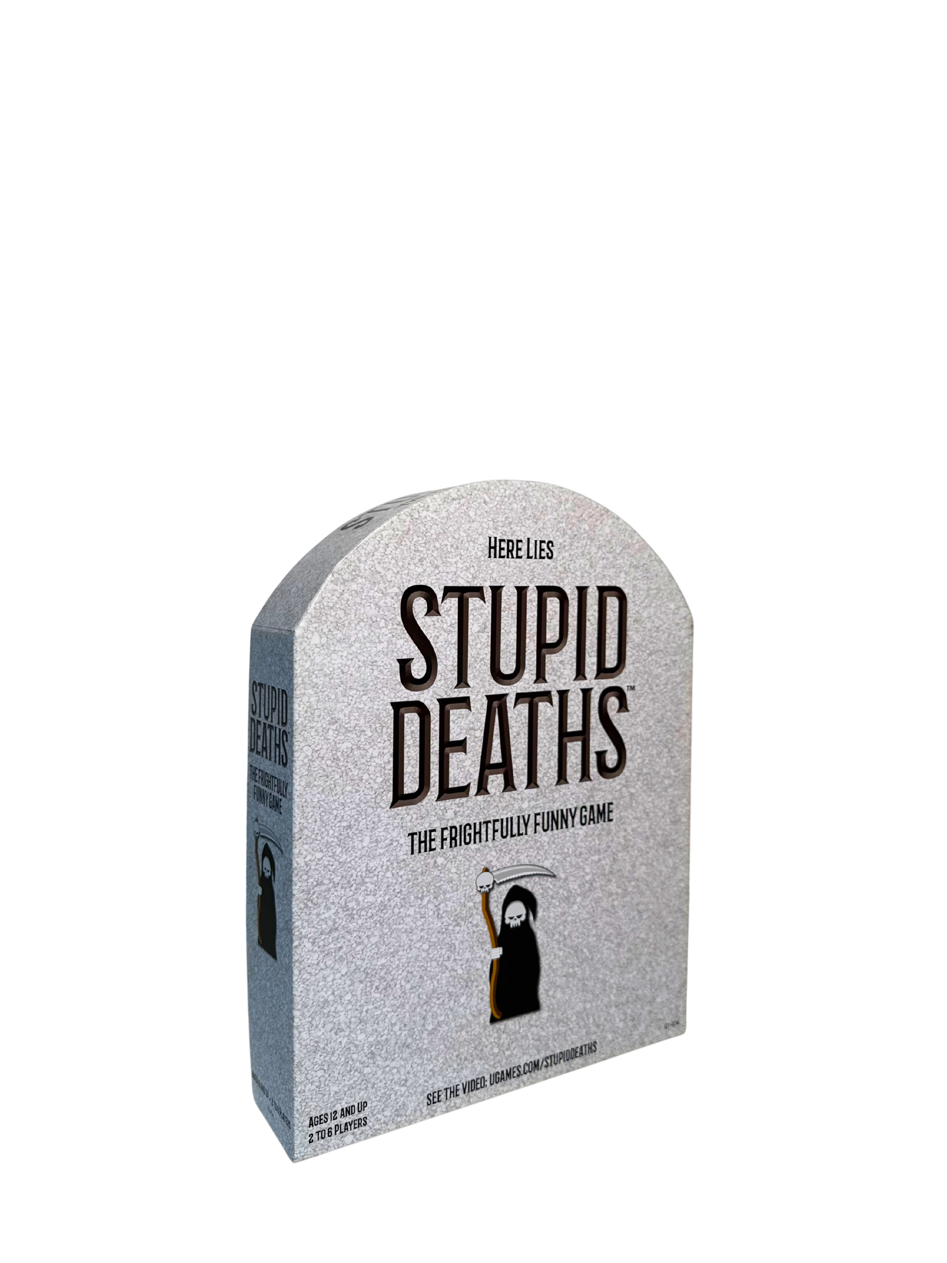 This is the game of dark fun, where players who are dead right win! Many people die in utterly ridiculous ways, and Stupid Deaths challenges players to identify myth versus fact. In this hilarious party game, players work to beat the Grim Reaper before the Grim Reaper beats them. Players start the game with a True and a False Voting Card as well as an Extra Life Token. All the players begin on the Green space, half way around the board from the Red space where the Grim Reaper starts his chase. The first player takes the top Stupid Deaths Cards and reads it aloud, individually all the other players have to decide if the scenario is real or made up and turn over either their True or False Voting card. Each player who has voted correctly moves their player piece one space closer to home and away from the chasing Grim Reaper. For each player who voted incorrectly the player must move the Grim Reaper one space forward towards their own piece! When the Grim Reaper catches up, lands or passes a play piece, that player has been Ôtouched by deathÕ and is out of the game unless they use their Extra Life Token to give them one more chance. ItÕs a race against Death to be the first player home and reach the Red space!